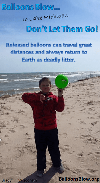 Our friend Brady in Wisconsin found this balloon polluting the shoreline of Lake Michigan. Good save!