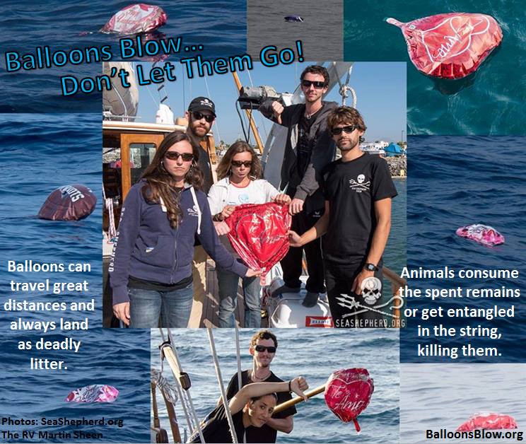 Our friends, the crew of The RV Martin Sheen, collected over 30 balloons after Valentine's Day off the coast of California. Thumbs down to balloons, thumbs up to all of you!