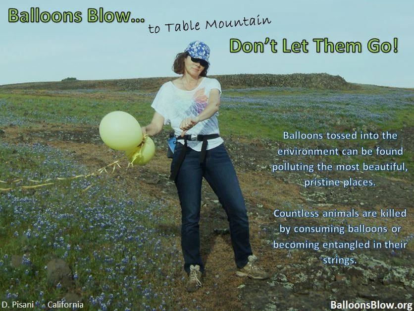 Our friend Debbi in California found this ugly tangle of latex balloons while hiking & enjoying the beautiful wild flowers on Table Mountain in Oroville. The balloons came down just a few hundred yards away & she sprinted over the uneven lava outcroppings to retrieve it before the wind blew it out of reach. Nice save!