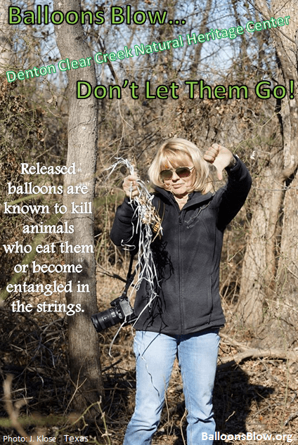 Our friend Mel in Texas found this trashy tangle of balloon ribbon polluting the hiking trail at Denton Clear Creek Natural Heritage Center. Nice save!
